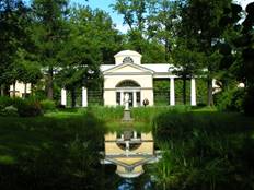 Часть прудов лежит в глубоких берегах, заросших соснами, и благодаря этому производит впечатление зеленых ущелий; другие пруды полноводны и извиваются в густой еловой чаще. На одном из последних, обросшем у берегов ирисами, находится овальный Венерин остров с остатками трельяжа, построенного Гонзаго. Окрестности "Белой березы" - лучший образец, но и весь парк был пройден его рукой, и такие дивные пейзажи имеются и на Краснодолинных прудах, и в долине Славянки, и на "Парадном месте". Конечно, много деревьев засохло, иногда на полянах посажены ненужные лиственницы и кедры, а иногда вырублены великолепные разлегшиеся по земле ветлы, но картины, созданные гениальным мастером, еще целы и заслуживают самого внимательного отношения и изучения. Только что упомянутые Краснодолинные пруды начинаются у "Круглого зала", который был построен в конце царствования императора Павла в центре так называемой "Звезды", т.е. обширного краевого участка парка, лежащего на левом берегу Славянки.