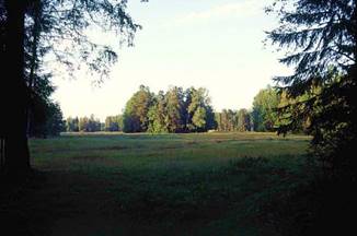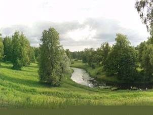 Берега Славянки ниже Пиль-башни - один из лучших образцов пейзажного парка. Полноводная речка извивается по неширокой долине, наверху склоны поросли