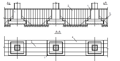 1 - стовпчастий фундамент; 2 - залізобетонна перемичка; 3 - арматурні каркаси; 4 - розширена частина залізобетонної перемички.