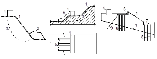 а - контрбанкетом; б - контрфорсом; в - утримуючими конструкціями; 1 - поверхня схилу; 2 - контрбанкет; 3 - поверхня ковзання зсуву; 4 - будівля; 5 - контрфорс; 6, 7 – верхова і низова утримуючі конструкції; 8 - буронабивні палі; 9 - анкер.