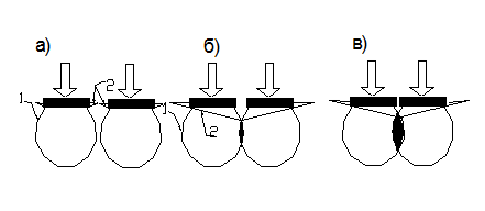 Рис 7.1 Взаємний вплив двох фундаментів а - напружені зони не перекриваються; б, в - зони напруг перекриваються;