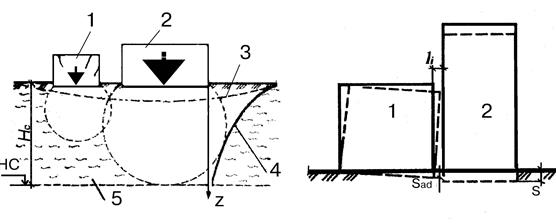 Рис. 7.2 Осідання поверхні ґрунту (а) і характер деформації різнононавантажених будівель (б), розташованих поблизу одна від одної: 1 - існуюча будівля; 2 – новозбудована; 3 - вирва осідання; 4 –епюра осідання поверхні ґрунту; 5 - стислива товща.