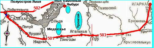 И всё-же поражает мудрость людей, которые проектировали эту стройку. Посмотрите внимательно в междуречье Оби и Енисея — дорога проходила через нефтегазоносные районы этого региона, и будь она построена, насколько быстрее страна получила бы отсюда, и с меньшими затратами, нефть и газ. А ведь дорогу туда — до Тазовской губы — все равно построили, только она прошла по меридиану — от Тюмени на север, на несколько тысяч километров по тайге и тундре.
