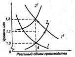 Анализ развития инфляции, инспирированной спросом, схематически можно представить следующим образом. Предположим, что в экономике существует равновесие. Графически оно выражается в пересечении кривых совокупного спроса 1 и предложения 2 в точке А с реальным естественным уровнем объема производства при данном (базовом) уровне цен.
