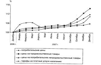 Рост цен по продовольственной группе товаров оказал наиболее заметное влияние на итоговый уровень инфляции. Следует отметить, что только в IV квартале 2007 г. темпы роста цен на продовольствие составили 109,1%, в то время как за предыдущие девять месяцев они равнялись 106,3%.