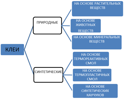 происхождения: крахмальный, декстриновый, смоляной, нитроклей. На основе крахмала и декстрина – порошки с добавлением антисептиков и веществ, препятствующих комкованию. У них слабая клеящая способность. Применяют в текстильном производстве, а смоляные – широко применяются в бумажном. Нитроклей – это жидкость, которую получают, растворяя нитроцеллюлозу в ацетоне и добавляя пластификатор. Этот клей используется в мебельном и кожевенном производстве.
