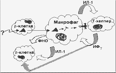 В островках Лангерганса iNOS образуется, по-видимому, только в b-клетках. В островках человека синтез мРНК и белка iNOS индуцируется при одновременном наличии двух или трех цитокинов: ИЛ-1 + ИФg или ИЛ-1 + ИФg + ФНО. В целом повреждение и гибель -клеток при аутоиммунной реакции можно представить следующим образом: