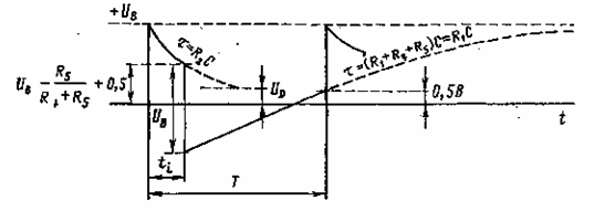 Цепи запирания. Частота повторения генератора импульсов определяется продолжительностью периодов заряда или разряда конденсатора. Изменение напряжения на конденсаторе при заряде через резистор имеет экспоненциальный характер, а при заряде током постоянной величины — линейный. Один из возможных принципов запирания иллюстрируется на рис. 7.