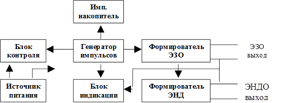 Высокая экономичность достигается за счет применения оригинальной схемы импульсного накопителя, который в течение короткого промежутка времени в паузе между стимуляцией импульсами преобразует постоянное напряжение источника питания в регулируемое выходное напряжение. Из накопителя выходное напряжение поступает на формирователь ЭЗО, на выходе которого формируется импульсы для стимуляции сердца. Одновременно в формирователе ЭНДО импульсы напряжения масштабно преобразуются в импульсы тока меньшей амплитуды и длительности для эндокардиальной стимуляции сердца. Частота следования и длительность импульсов задаются генератором импульсов мостового типа (регулировки – на панели).