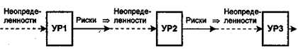 Неопределенности — основная причина появления рисков. Поэтому уменьшение объема неопределенностей, вызывающих риски потерь, составляет важную задачу руководителя. Если имеется несколько УР, следующих друг за другом, то риски предшествующих УР становятся неопределенностями для последующих (рис. 2).