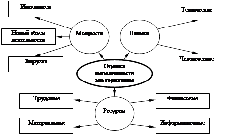 Оценка выполнимости альтернативы означает выяснение соответствия объема и ассортимента требуемых ресурсов доступным ресурсам или тем, которые могут быть получены.