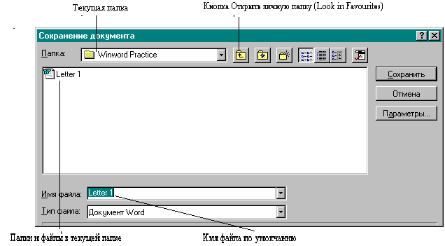 Ваше письмо будет сохранено под именем Letter 1 в папке WinwordPractice. Лучше всего сохранять документ сразу вскоре после того, как вы начали над ним работу. А в дальнейшем желательно сохранять его примерно через каждые 15 мин. Кнопка Сохранить