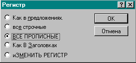 MicrosoftWord позволяет изменять регистр букв в выделенном фрагменте текста, т. е. менять прописные буквы на строчные и наоборот. Команда Регистр (