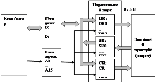 Для багатьох практичних задач потрібно зв’язати комп’ютер із зовнішніми пристроями. Без цього неможлива ні автоматизація фізичного експерименту, ні комп’ютерне управління технологічними процесами. Зовнішні пристрої можуть бути як стандартними (принтер), так і нестандартними (пристрої для наукових досліджень, крокові двигуни, роботи-маніпулятори). Основне призначення Centronics (аналог ИРПР-М) – це під’єднання до комп’ютера принтерів різних типів. Тому розміщення контактів роз’єму, призначення сигналів та програмні засоби орієнтовані на це застосування. В той же час через Centronics можна керувати й нестандартними зовнішніми пристроями. Перевагами Centronics є стандартність, простота та паралельність (рис.1) та низька ймовірність вивести комп’ютер з ладу (порівняно з ISA). Для зв’язку комп’ютера із зовнішніми пристроями служать порти. Одні порти служать для вводу даних в комп’ютер, а інші - для виводу. Дані в порт записуються і зчитуються по шині даних D0-D7 (8 біт), а для вибору конкретного порту використовується шина адреси A0-A15 (16 біт).