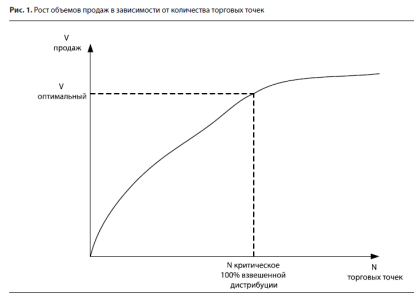 ВД), измеряемая в процентах: отношение общего товарооборота продукта (пельменей) в торговых точках, имеющих в продаже бренд компании ("Пельмени №1"), к общему товарообороту этого продукта (пельменей) на территории. Собрать информацию о товарообороте пельменей на территории того или иного города очень непросто (хотя компания AC Nielsen это делает), поэтому для расчета взвешенной дистрибуции продукта можно использовать следующую методику. Необходимо определить количество (составить список) торговых точек, которые можно отнести к ключевым розничным каналам сбыта для вашего продукта. Это число обычно называют критическим количеством магазинов (N критическое), а существующий охват магазинов, попавших в список "N критическое", и является показателем взвешенной дистрибуции.