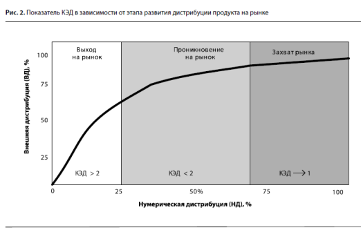 Продажа продукции через ключевую розницу дает значимый прирост продаж при увеличении магазинов, ориентированных на целевых потребителей, охват неключевой розницы незначительный. Для оценки эффективности дистрибуции обычно используют коэффициент эффективности дистрибуции (КЭД), который равен отношению показателя взвешенной дистрибуции к показателю нумерической дистрибуции.