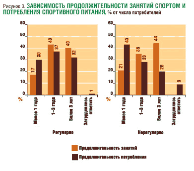 Сравнивая сегменты регулярного и нерегулярного потребления, можно увидеть четкую зависимость между длительностью занятий спортом и продолжительностью употребления спортивного питания. Стоит отметить, что в сегменте регулярного потребления эта зависимость прямая - с увеличением срока занятий спортом растет длительность потребления (рис. 3). В сегменте же нерегулярного потребления зависимость обратная - чем больше срок занятий спортом, тем меньше продолжительность потребления. Таким образом, потреблять продукты спортивного питания респонденты начинают чаще всего на первом этапе занятий, т.е. если продолжительность занятий составляет менее года.