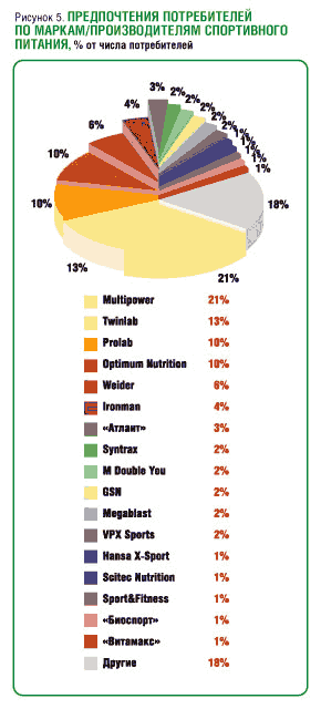 Наибольшей популярностью у потребителей пользуется спортивное питание Multipower* - его указали 21% респондентов (рис. 5). На втором и третьем месте располагаются такие марки, как Twinlab - 13% опрошенных, Prolab и Optimum Nutrition - по 10% ответов.