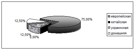 Проведенное исследование позволило установить, какую кухню предпочитают посетители кафе. Было установлено, что 75% респондентов предпочитают европейскую кухню, по 12,5% предпочтений приходится на украинскую и домашнюю кухню. Диаграмма результатов опроса респондентов представлена на Рисунке 2.