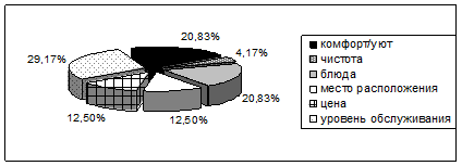 Установлено, что 29,17% (7) респондентов при выборе кафе руководствуются его уровнем обслуживания, для 20,83% (5) респондентов самое главное – вкусные блюда, такое же количество респондентов приоритетным для себя считает уют/комфорт кафе, по 12,5% (3) респондентов самым главным считают цену и место расположения кафе, и наименьшее количество респондентов – 4,17% (1) уделяют внимание чистоте.