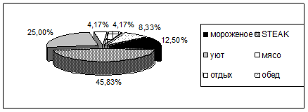 Респондентам предлагалось назвать словесную асоциацию на слова «кафе» и «мясо». На слово «кафе» наибольшее число респондентов - 45,83% (11) высказали ассоциацию «STEAK», что говорит о широкой популярности данного кафе, 25% (6) респондентов «кафе» ассоциируют с уютом, 12,5% (3) – с мороженым, 8,33% (2) – с обедом, и наименьшее количество респондентов – по 4,17% (1) – с мясом и с отдыхом. Диаграмма ассоциаций со словом «кафе» представлена на Рисунке 6.