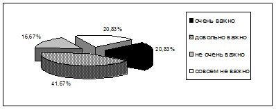 Среди других вопросов, у респондентов спрашивалось о степени важности наличия в кафе зала для курящих. В результате для 41,67% (10) респондентов наличие зала для курящих довольно важно, а для 20,83% (5) – очень важно. В сявзи с этим, появилась необходимость оборудовать в кафе специальный зал для курящих. Диаграмма степени важности наличия в кафе зала для курящих представлена на Рисунке 8.