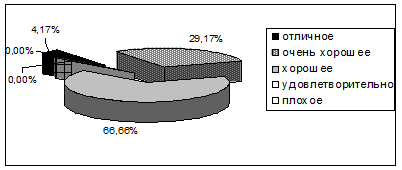 Анализ данных по оценке респондентами качества обслуживания в кафе «STEAK» показал, что только 4,17% (1) из них считают качество товара отличным, 29,17% (7) респондентов – очень хорошим и 66,66% (16) - хорошим. Диаграмма оценки респондентами качества обслуживания в кафе «STEAK» представлена на Рисунке 9.