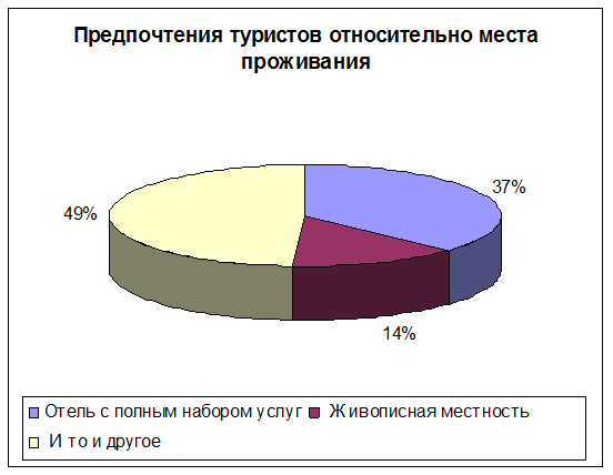 Если обратить внимание на диаграмму, которая находится в ПРИЛОЖЕНИИ 5, то можно сделать вывод: необходимы отели с живописной местностью для большинства туристов 37%+49%=86%. Из них 37% предпочитают лишь отель с полным набором услуг, но ясно, что для любой тур фирмы выгодно обеспечить клиентов отелем и живописной местностью чтобы был стопроцентный спрос.