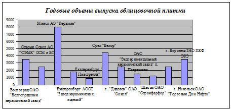 Как видно из диаграммы, ЗАО ПКФ ВКЗ занимает прочную среднюю позицию по годовому производству облицовочной плитки, и предполагаемое наращивание объемов выпуска до 5.6 млн. кв. м. в год, позволит при постоянно существующем дефиците продукции и соответствующей маркетинговой политике занять дополнительные доли рынка сбыта. Реальную конкуренцию смогут составить АО «Керамин», Беларусь, и АО «Велор», г. Орел.
