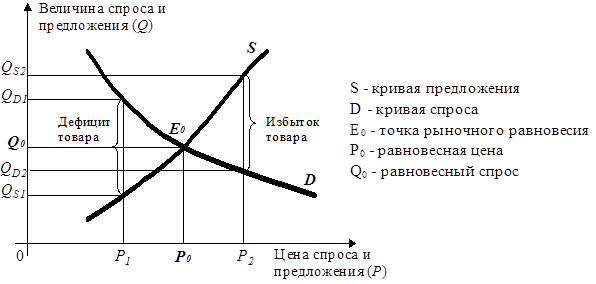 Таким образом, на конкурентном рынке в условиях, когда спрос на товар и предложение товара зависят только от цены, устанавливается равновесная рыночная цена, соответствующая выравниванию спроса и предложения, то есть точке пересечения кривых спроса и предложения.