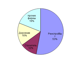 Из рис 3.1 и 3.2 видно, что «Ремстройбыт» занимает лидирующее положение на обоих рынках. Проведенный анализ показал, что предприятие «Донецкстрой», придерживаясь в своей деятельности более низких цен, по сравнению с «Ремстройбытом», проигрывает последнему по ассортиментному перечню предлагаемых строительных работ. Что касается фирм «Строитель» (г. Каменск) и «Дорожник» (г. Гуково), то их цены на строительные работы гораздо выше, чем у предприятия «Ремстройбыт», при этом «Дорожник» занимается, в основном, только дорожными работами, а фирма «Строитель» осуществляет, преимущественно, промышленное строительство.