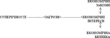 Мабуть вперше в економічній літературі висловив думку, що загрози безпеці (правда відносно фінансової безпеки) є зовнішнім проявом глибинних суперечностей, О.Барановський. Однак такий підхід все одно є недостатнім, тому що з позицій системного підходу необхідно мати завершену картину. Треба визначити взаємозв'язок не тільки наведених категорій, але й останніх із економічними законами і національними економічними інтересами як об'єктивною категорією.
