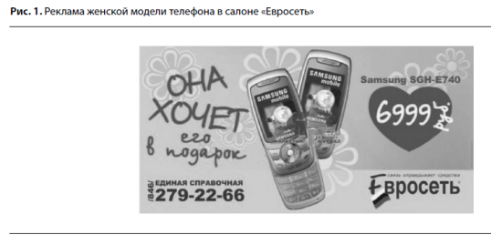 Компании «Евросеть», наверное, проще, чем многим другим, делать гендерную рекламу, поскольку разные модели сотовых телефонов изготавливаются уже с учетом интересов определенной потребительской аудитории. Например, к 8 Марта компания подготовила специальную рекламу телефона Samsung: «Она хочет его в подарок» (см. рис. 1).