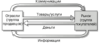 Традиционно "рынком" называли место, например деревенскую площадь, где собирались покупатели и продавцы, для того чтобы обменяться товарами. Экономисты используют этот термин применительно к группе покупателей и продавцов, которые обменивают один определенный товар или целый класс товаров; отсюда рынок бытовой техники, зерновой рынок и т. д. В то же время в маркетинге торговля рассматривается как представитель отрасли (совокупности компаний-поставщиков), а покупатели как составляющая рынка. На рис. 1 показаны отношения отрасли и рынка. Отношения продавцов и покупателей подразделяются на четыре потока. Со стороны продавцов идут потоки товаров, услуг и коммуникации (реклама, прямая почтовая рассылка и т. д.); навстречу им устремляются деньги и информация (отношение покупателей к товару, данные о продажах и т. д.). Внутренний круг - это обмен товаров и услуг на деньги; внешний круг - обмен информацией.
