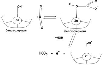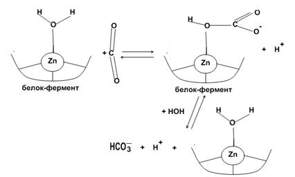 – Zn содержащий фермент. Фермент крови, содержится в эритроцитах. Карбоангидраза катализирует процесс обратимой гидратации CO2