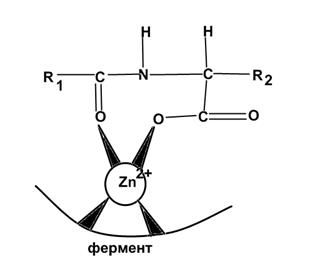 Схема взаимодействия цинка карбоксипептидазы с субстратом ("цинк-карбонил"):