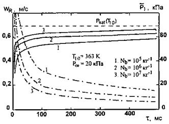 Поведение отдельного пузырька внутри ансамбля при тождественных условиях отличается от поведения одиночного пузырька в бесконечном объеме жидкости тем заметнее, чем сильнее проявляется фактор неодиночности пузырьков, т.е. чем выше концентрация Nb. На рис.1 показано, как меняются во времени среднее давление в межпузырьковом пространстве ансамбля и скорость расширения пузырьков после мгновенного сброса внешнего давления от начального равновесного значения Рi0 = Psat(Tlo) — 2s/R до величины рex<plo. Среднее давление в жидкости быстро возрастает, приближаясь затем постепенно к значению Psat(Tl). Давление стабилизируется тем быстрее, чем выше Nb. При больших концентрациях квазиравновесное давление со временем постепенно понижается по мере роста пузырьков в ансамбле, что объясняется постепенным охлаждением жидкости и уменьшением величины Psat(Tl). Различие в окружающем давлении обусловливает различие скоростей роста пузырьков в ансамбле при различных концентрациях, что видно из рисунка. При любых значениях Nb скорость расширения поверхности, одинаково высокая в начальной стадии, очень быстро падает и затем медленно уменьшается, так что со временем скорость роста пузырьков перестает зависеть от их концентрации и скорости роста пузырьков в ансамбле (штрихпунктир) при резком сбросе среднего давления.