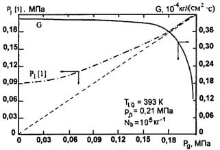 Выше отмечалось, что при описании нестационарного течения из закрытых каналов модель предсказывает появление кризиса течения, начиная с определенных для каждого режима значений противодавления рсr. При стационарных течениях вскипающих потоков модель также предсказывает эффект запирания. Критический режим течения при постоянном массовом расходе наблюдается для значений противодавления рg < рсr, причем для всех исследованных значений Tl0 критическое значение противодавления можно оценить из соотношения рсr /рo@ 0,8. В качестве примера на рис. 6 приведена типичная зависимость массового расхода потока от величины противодавления. На этом же рисунке показано, как меняется величина давления Рl[1] на выходе из канала (в 1-й зоне). Давление в жидкости на границе с газовой средой отличается от величины противодавления (пунктир) тем сильнее, чем ниже величины pg, т.е. чем больше режим истечения уходит в критическую область. Вне критической области с ростом рg давление в жидкости на срезе канала асимптотически приближается к соответствующему значению противодавления.