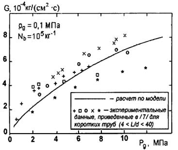 Рис.7. Зависимость расхода вскипающей жидкости от давления на входе при стационарном истечении. Сравнение расчетных данных с экспериментальными.