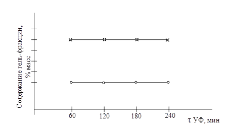 Варьирование содержания компонентов в композиции показало повышение величины гель-фракции в полимеризате с увеличением количества ГМА с 30 до 70%, соответственно (см.таблицу). Наблюдается увеличение содержания гель-фракции составов 60 ГМА: 40 ФОК; 70 ГМА:30 ФОК сверх аддитивного значения, тогда как для композиций, содержащих ГМА и ФОК в соотношении 1:1, не характерно данное явление. Отмечено увеличение гель-фракции с повышением количества ФК в композиции (см.таблицу) и незначительное влияние времени полимеризации на степень сшитости структуры (см.рисунок).