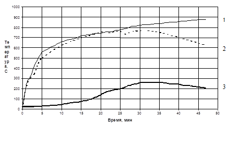 Рис. 2. Данные испытания многослойной конструкции на основе геля г2: 1-температура внутри печи по ГОСТ; 2-фактическая температура внутри печи; 3-температура наружного стекла