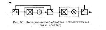 Последовательно-обводная технологическая связь (байпас) - это такая технологическая связь, при реализации которой часть выходного потока из одного элемента минует некоторые элементы ХТС в последовательной цепи аппаратов, а затем снова объединяется с основным потоком. Примером такой связи является цепочка аппаратов: делитель потоков, теплообменник, смеситель потоков (рис. 1, 3) для регулирования температуры на выходе теплообменного узла. Кроме того, байпас широко применяется в системах переработки с последующим смешением, где для обеспечения заданного состава и качества продукта необходимо переработать не весь поток, а лишь часть его. Потоки смешиваются в таком соотношении, чтобы получился продукт заданного качества.