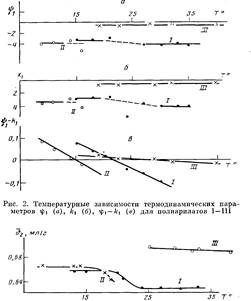 На рис. 2 представлены температурные зависимости параметров гр±, А-ч и разности г|)1—к,. Полученные данные показали, что процесс растворения всех трех полимеров протекает экзотермически (Ач<0) и сопровождается возникновением ориентации молекул растворителя около молекул полимера (i|)i<0). Нужно учесть, что донорно-акцепторные связи указанного выше типа не относятся к числу слабых. В области, близкой к 6-темпера-туре, наблюдается разброс экспериментальных значений и kt
