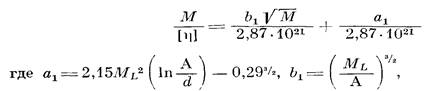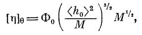 Ранее нами было показано [7], что моделью для описания поведения макромолекул полимера I в ТГФ может служить гауссов клубок, образованный цепями конечной длины, и найдено экспериментальное значение сегмента Куна, равное 30 А. При выборе модели для описания поведения макромолекул полимера II в ТГФ мы руководствовались теми же соображениями, что и в работе [7], поскольку так же, как и в работе [7]. параметр а в уравнении Марка — Куна — Хаувинка в 8-условпях не равнялся 0,5 (а=0,61) и заметно влияние растворителя па гидродинамические параметры (например, на [л]). Мы также воспользовались моделью клубка, образованного цепями конечной длины. Была построена зависимость М/[п] от √М и проведен расчет по уравнению [13]