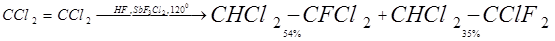 При присоединении фтористого водорода очень часто происходит частичное замещение галогена фтором. Подобный обмен можно облегчить, если в реакционную смесь ввести дихлортрифторид сурьмы: