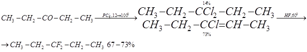 возможно при присоединении фтористого водорода к ацетиленам или при присоединении фтористого водорода к галогенолефинам с галогеном при двойной связи, причем может произойти частичное или даже полное замещение галогена фтором. Те же продукты образуются при реакции фтористого водорода или фторидов сурьмы с геминальными дигалогенпарафинами, которые легко могут быть получены из кетонов. Реакцию хорошо иллюстрирует получение 3,3-дифторпентана из диэтилкетона: