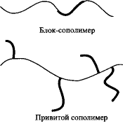 Если в синтезе полимера участвовало более одного вида мономеров, его называют сополимером. Мономерные звенья в сополимере могут быть либо статистически распределены, либо образовывать блоки, либо цепи одного из мономеров прививаются к цепи другого мономера как к основе, как это показано на рис. 1, б. Свойства растворов и поверхностные химические свойства очень сильно зависят от того, к какой группе принадлежит сополимер. Некоторые структуры, приведенные на рис. 1, б, обладают поразительной поверхностной активностью.
