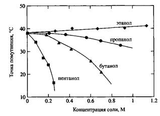 Как и поляризующиеся ионы, высшие спирты адсорбируются на макромолекулах этилгидроксиэтилцеллюлозы. Однако в этом случае точка помутнения полимера понижается, поскольку комплекс полимер-спирт оказывается более гидрофобным.