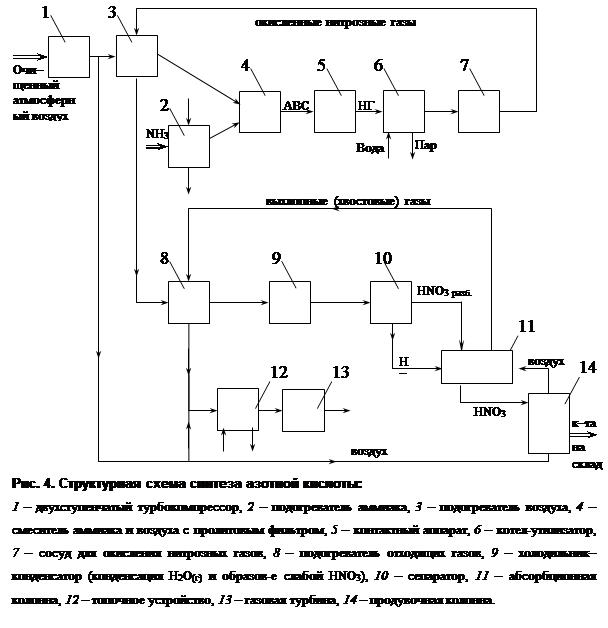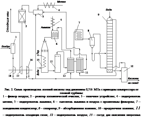 В 1960-ых годах разработан агрегат по производству азотной кислоты мощностью 120 тыс. т/год под давлением 0,716 МПа с использованием высокотемпературной каталитической очистки выхлопных газов, выпускающий продукцию в виде 53–58% -ной HNO3. Технологическая схема этого производства в упрощенном варианте представлена на рисунке 2.