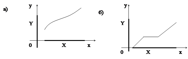 Функция с графиком (а) является инъективной, так как каждая горизонтальная прямая, проходящая через точку b оси OУ имеет не более, чем одну общую точку с графиком. Эта функция не является сюръективной, так как, например, горизонтальные прямые, проходящие через точки с отрицательными ординатама, не пересекают график функции ни разу.График (б) – это график функции, которая сюръективна, но не инъективна. Каждая горизонтальная прямая, проходящая через точки У, обязательно имеет хотя бы одну общую точку с графиком. Однако, у самой функции имеется горизонтальный участок, поэтому при соответствующем значении у